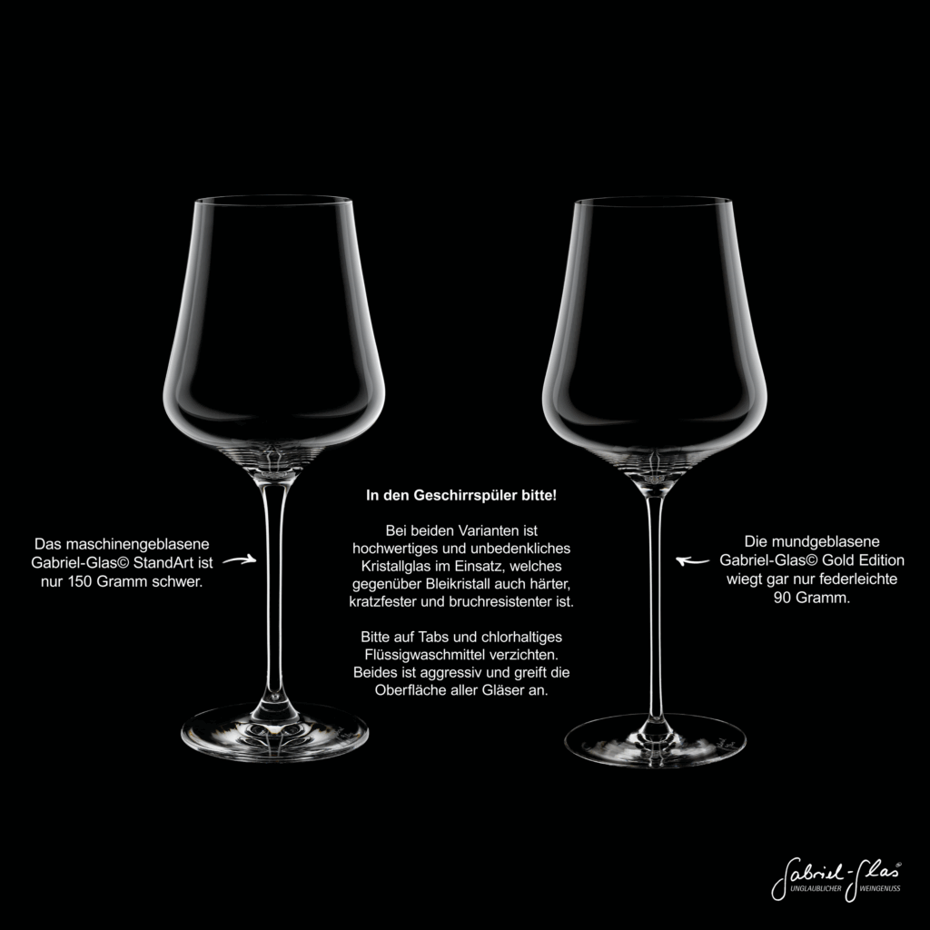 Was ist der Unterschied zum «StandArt» Glas? Die Form ist identisch – der Unterschied ist ca. 60g mit minimsten Abweichungen, welche vielleicht gerade deshalb nochmals eine Genussmultiplikation ermöglichen. René Gabriel würde sagen, mit der «Gold Edition» bin ich mit dem Wein «per Du».